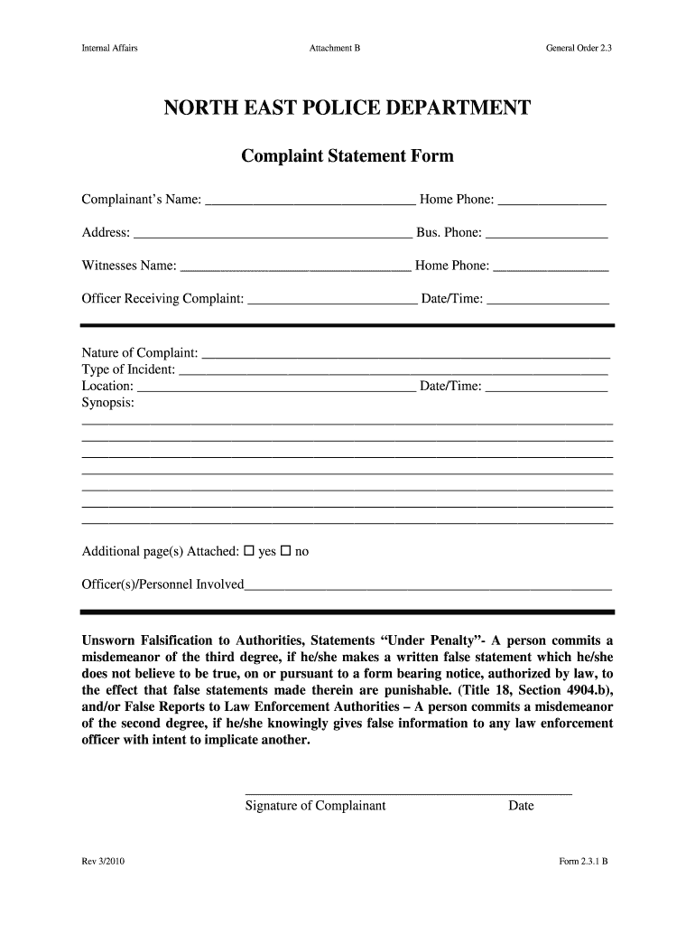 Internal AffairsAttachment General Order 2.3NORTH EAST POLICE DEPARTMENT Complaint Statement Form Complainants Name: Home Phone: Address: Bus. Phone: Witnesses Name: Home Phone: Officer Receiving