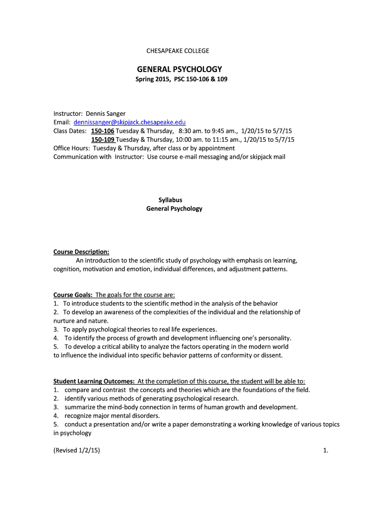 CHESAPEAKE COLLEGEGENERAL PSYCHOLOGY Spring 2015, PSC 150106 & 109Instructor: Dennis Sanger Email: dennissanger skip jack.Chesapeake.edu Class Dates: 150106 Tuesday & Thursday, 8:30 am. To 9:45 am.,