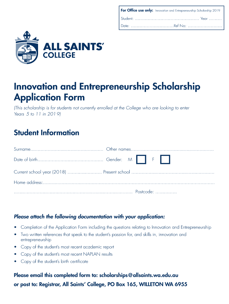 Date:Innovation and Entrepreneurship Scholarship 2019............................................. Year ....................................... Ref No: ........................