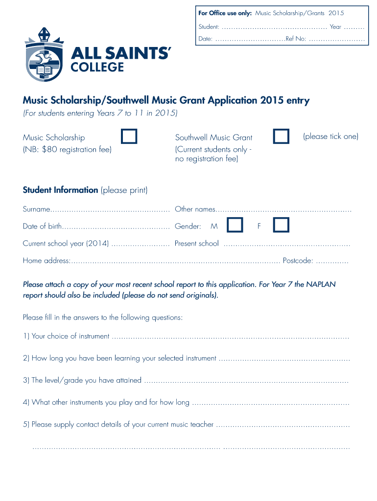 Date:............................................. Year ....................................... Ref No: ........................ Music Scholarship/South