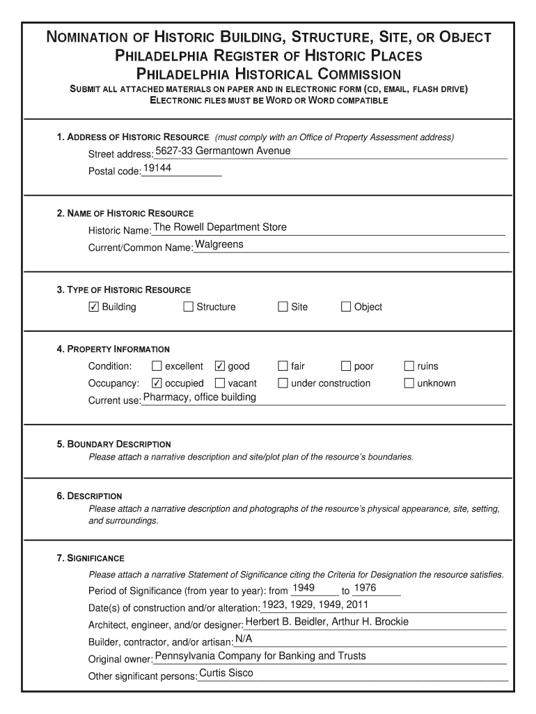 1. ADDRESS OF HISTORIC RESOURCE (must comply with an Office of Property Assessment address) 562733 Germantown Avenue Street address: 19144 Postal code: 2. NAME OF HISTORIC RESOURCE The Rowell Department