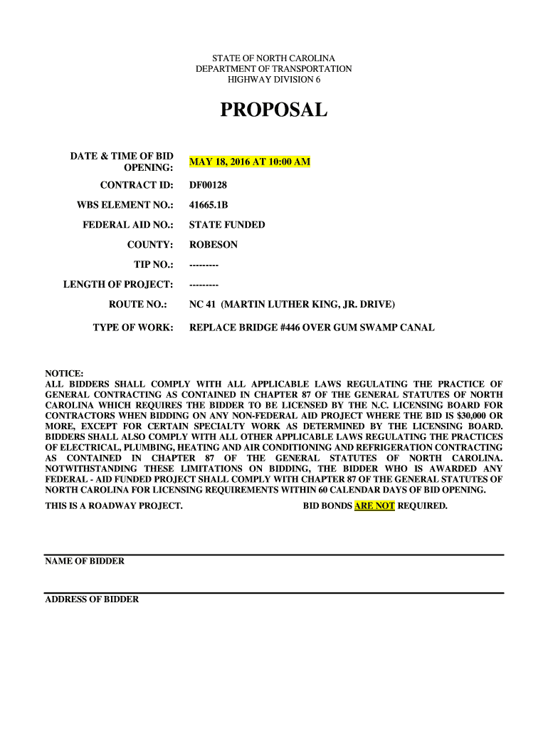 STATE OF NORTH CAROLINA DEPARTMENT OF TRANSPORTATION HIGHWAY DIVISION 6PROPOSAL DATE & TIME OF BID OPENING:MAY 18, 2016, AT 10:00 CONTRACT ID:DF00128WBS ELEMENT NO.:41665.1BFEDERAL AID NO.: COUNTY:STATE