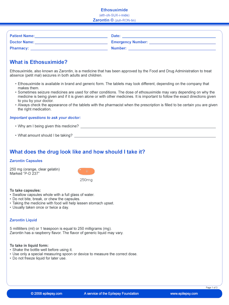 The Ethosuximide Patient Information Form is a healthcare document used by patients to understand medication instructions and safety information about Ethosuximide (Zarontin).