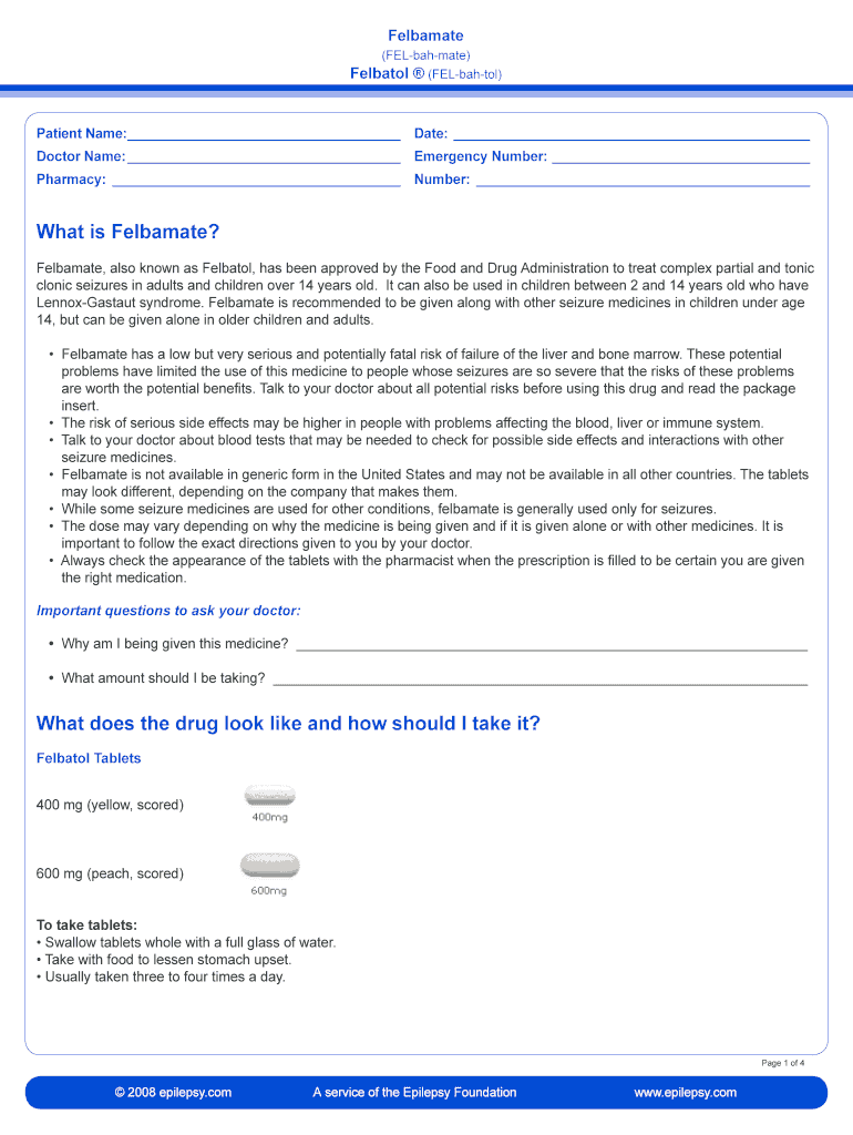 The Felbamate Patient Information Form should be completed by patients prescribed Felbamate, or their caregivers, to ensure they understand the medication's usage, dosage, and potential side effects.