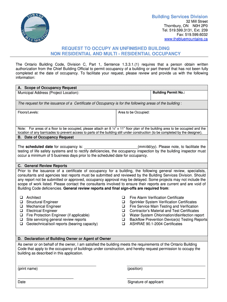 Building Services Division 32 Mill Street Thorn bury, ON N0H 2P0 Tel. 519.599.3131, Ext. 239 Fax: 519.599.6032 www.thebluemountains.ca REQUEST TO OCCUPY AN UNFINISHED BUILDING NON-RESIDENTIAL AND