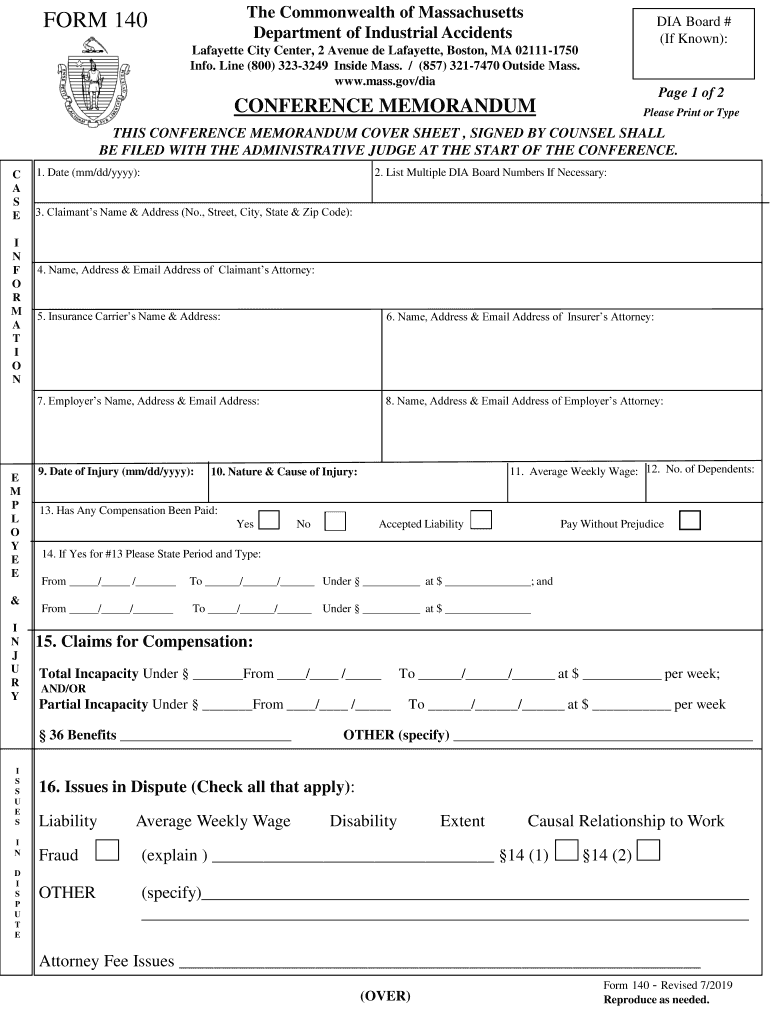The Commonwealth of Massachusetts Department of Industrial AccidentsFORM 140DIA Board # (If Known):Lafayette City Center, 2 Avenue de Lafayette, Boston, MA 021111750 Info. Line (800) 3233249 Inside