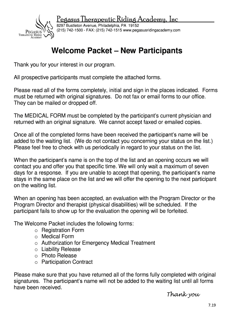 Pegasus Therapeutic Riding Academy, Inc 8297 Bustle ton Avenue, Philadelphia, PA 19152 (215) 7421500 FAX: (215) 7421515 www.pegasusridingacademy.comWelcome Packet New Participants Thank you for your