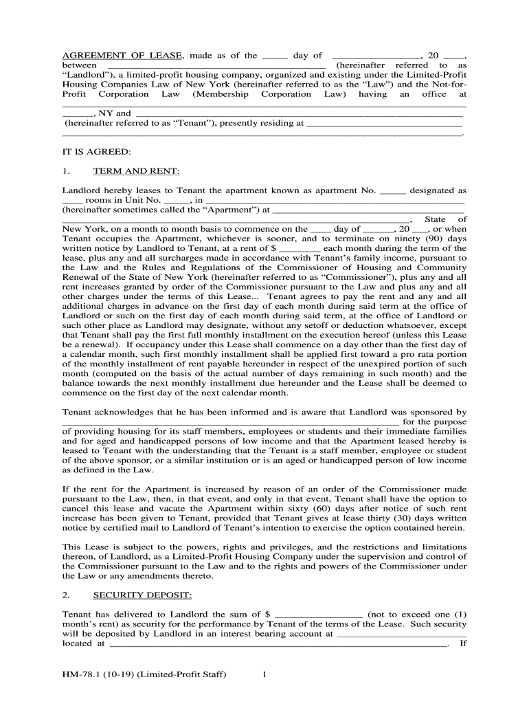 Get the free Agreement of Lease, Limited-Profit Staff (10-19), HM-78.1