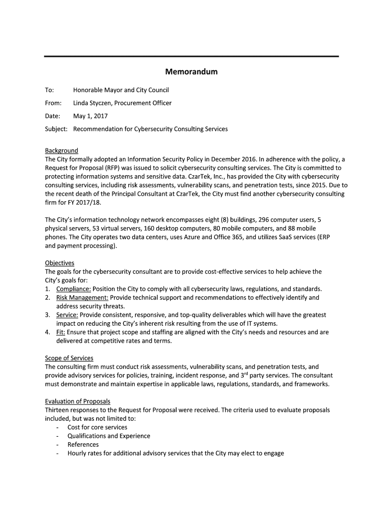 Memorandum To:HonorableMayorandCityCouncilFrom:LindaStyczen, ProcurementOfficerDate:May1,2017Subject: RecommendationforCybersecurityConsultingServices Background TheCityformallyadoptedanInformationSecurityPolicyinDecember2016.