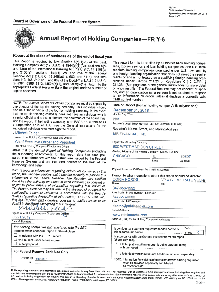 FRY6 0 MB Number 71000297 Approval expires November 30, 2019-Page 1 of 2Board of Governor s of the Federal Reserve Systematical Report of Holding Companies FR Y6 Report at the close of business as
