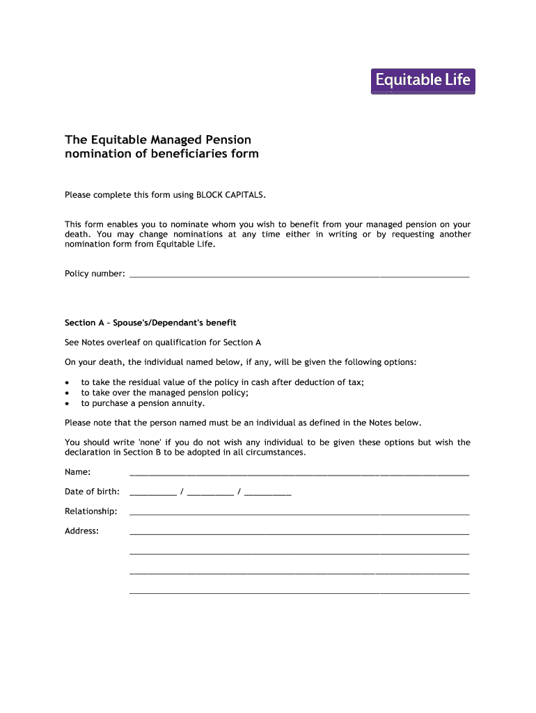 The Equitable Managed Pension nomination of beneficiaries formulas complete this form using BLOCK CAPITALS. This form enables you to nominate whom you wish to benefit from your managed pension on