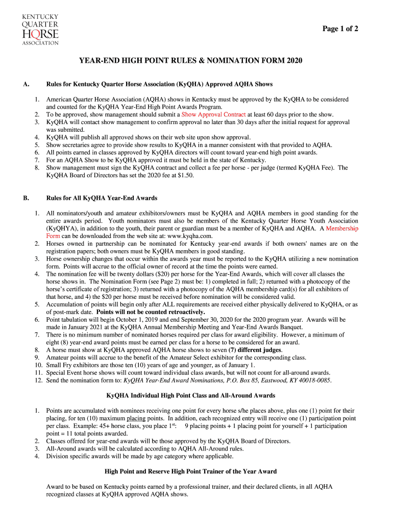 Page 1 of 2YEAREND HIGH POINT RULES & NOMINATION FORM 2020 A. Rules for Kentucky Quarter Horse Association (YMHA) Approved AQUA Shows 1. 2. 3. 4. 5. 6. 7. 8. B. American Quarter Horse Association