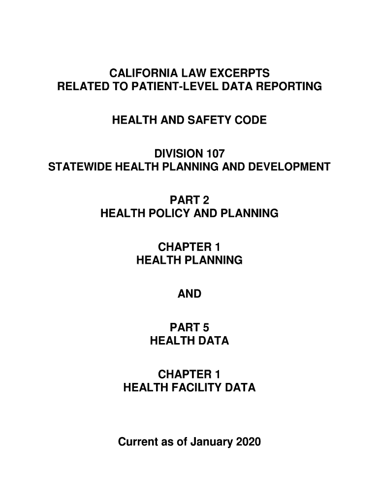 CALIFORNIA LAW EXCERPTS RELATED TO PATIENTLEVEL DATA REPORTING HEALTH AND SAFETY CODE DIVISION 107 STATEWIDE HEALTH PLANNING AND DEVELOPMENT PART 2 HEALTH POLICY AND PLANNING CHAPTER 1 HEALTH PLANNING