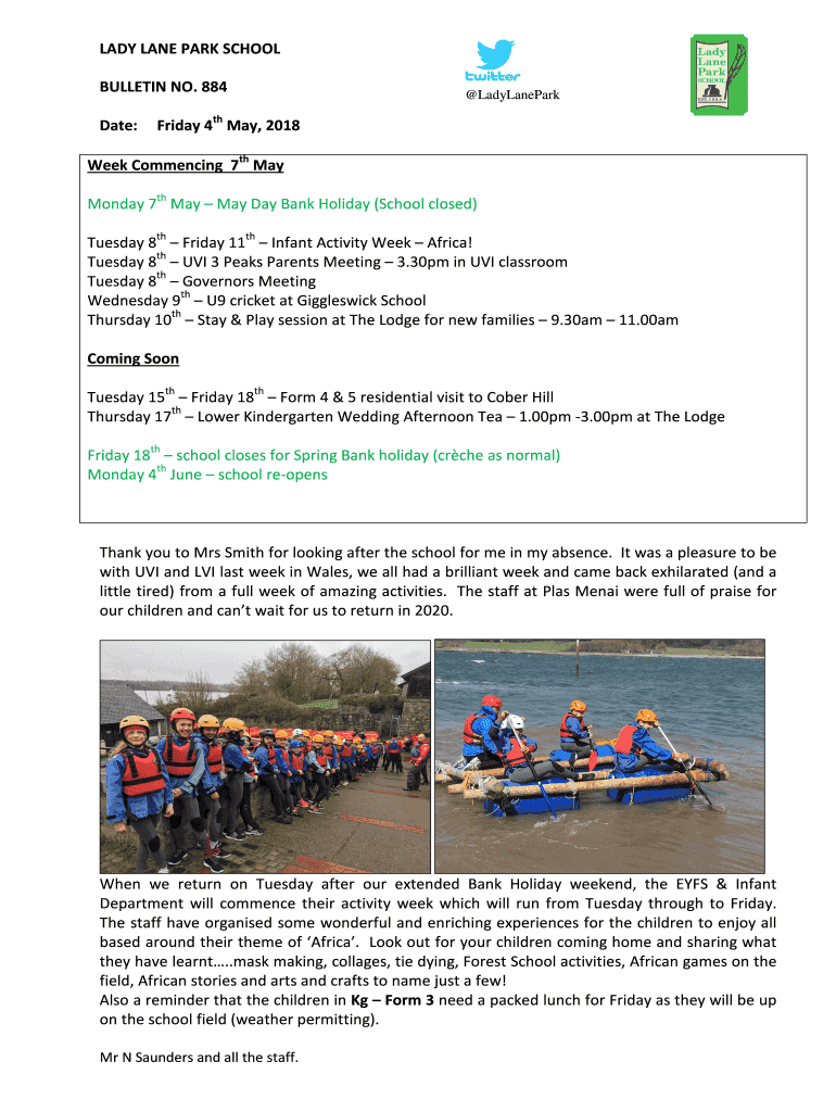 LADY LANE PARK SCHOOL BULLETIN NO. 884 Date: LadyLaneParkFriday 4th May 2018 three Commencing 7 May Monday 7th May Day Bank Holiday (School closed) ththTuesday 8 Friday 11 Infant Activity Week Africa!