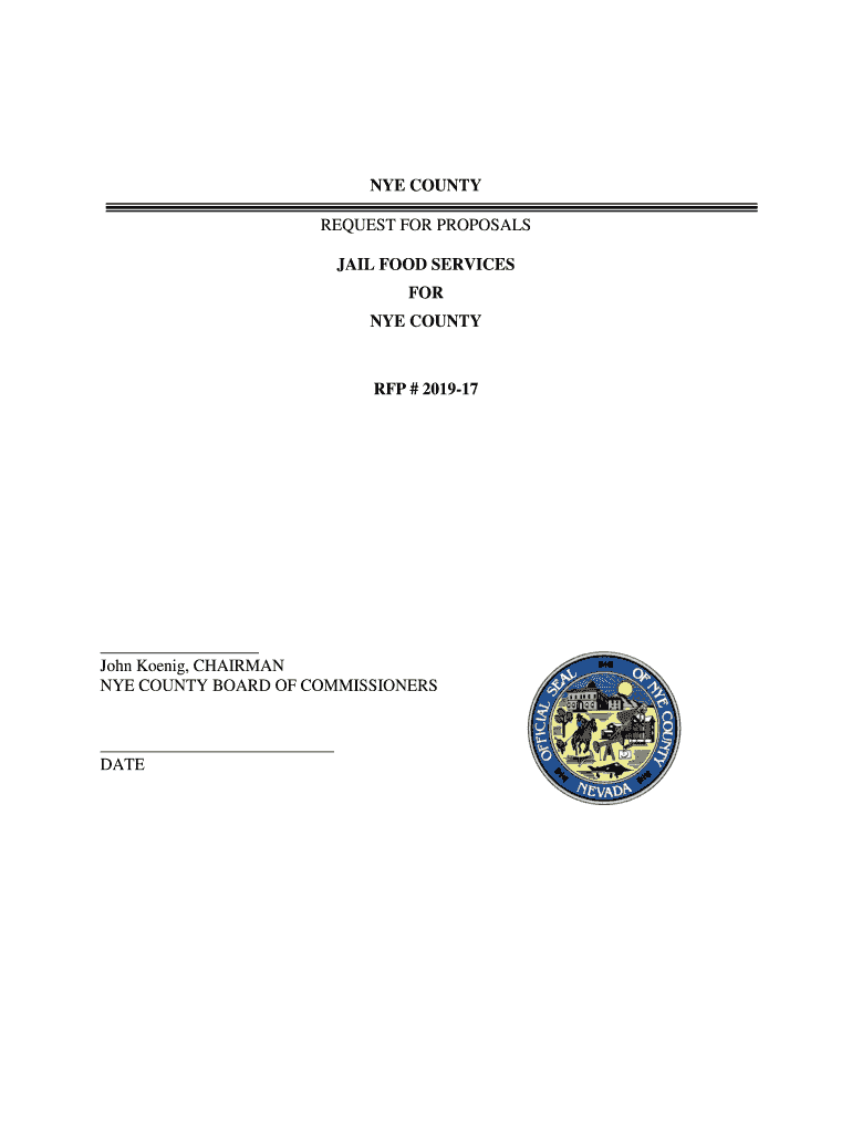 NYE COUNTY REQUEST FOR PROPOSALS JAIL FOOD SERVICES FOR NYE COUNTY RFP # 201917 John Koenig, CHAIRMAN NYE COUNTY BOARD OF COMMISSIONERS DATE1.0INVITATION The NYE COUNTY BOARD OF COMMISSIONERS is accepting