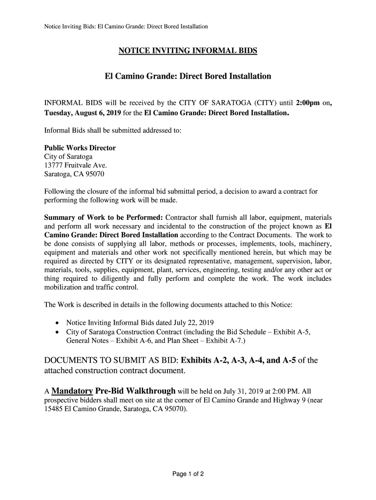 Notice Inviting Bids: El Camino Grande: Direct Bored InstallationNOTICE INVITING INFORMAL Diesel Camino Grande: Direct Bored Installation