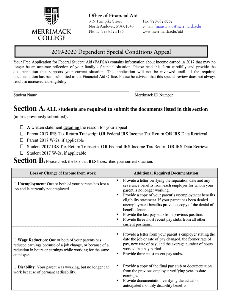 www.merrimack.edu/aid20192020 Dependent Special Conditions Appeal