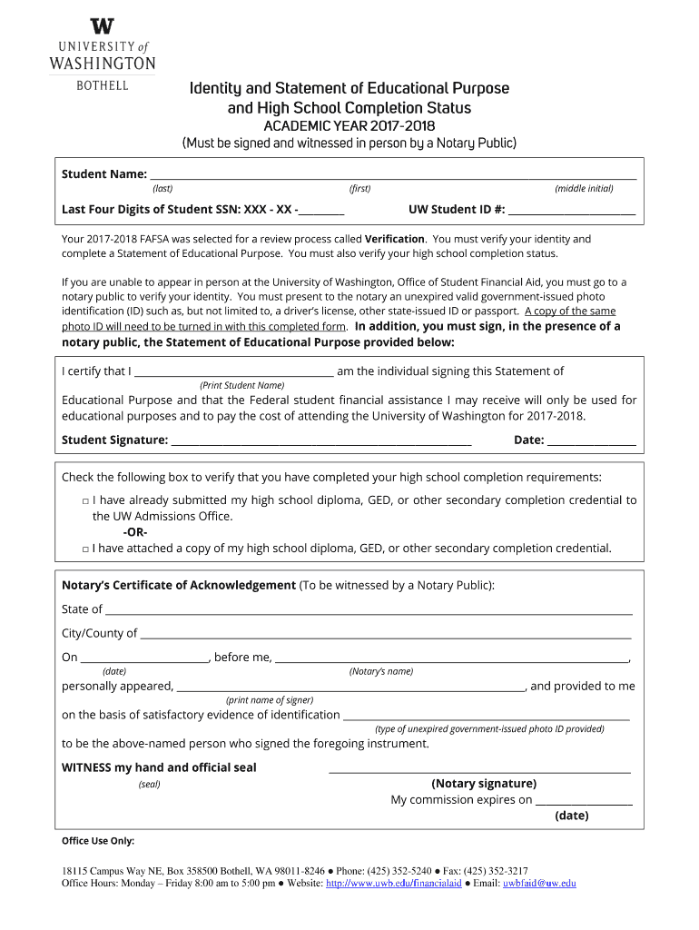 Student Name: (last)(first)Last Four Digits of Student SSN: XXX XX (middle initial)UW Student ID #: Your 20172018 FAFSA was selected for a review process called Verification. You must verify your