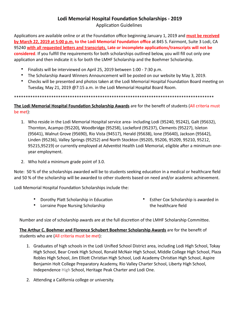 Lodi Memorial Hospital Founda3on Scholarships 2019 Applied 'on Guidelines Applied 'ONS are available online or at the Found 'on one beginning January 1, 2019, and must be received by March 22, 2019,