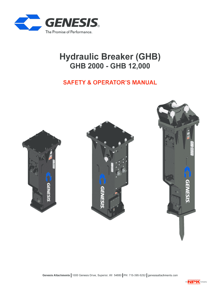 Hydraulic Breaker (GHB) GHB 2000 GHB 12,000SAFETY & OPERATORS MANUALCONTACT INFORMATION Genesis Attachments 1000 Genesis Drive Superior, WI 54880 USA Toll Free: 888SHEARIT (8887432748)Europe/Africa/Middle
