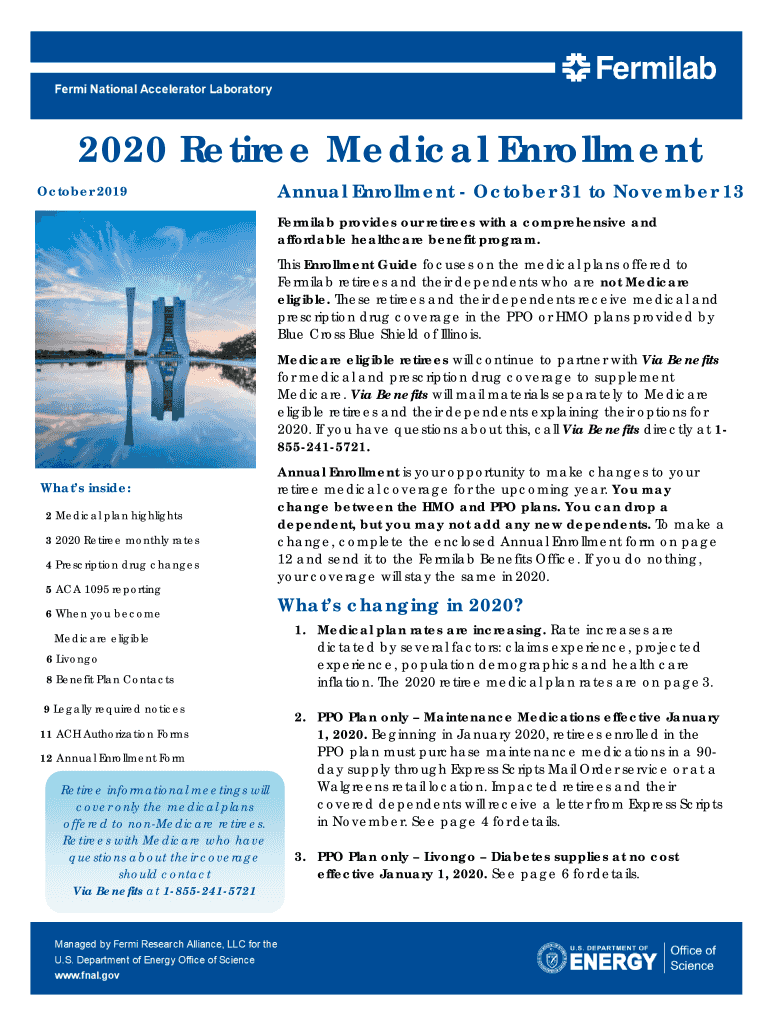 2020 Retiree Medical Enrollment October 2019Annual Enrollment October 31 to November 13 Fermi lab provides our retirees with a comprehensive and affordable healthcare benefit program. This Enrollment