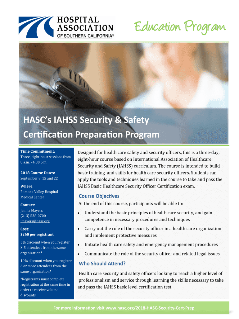 Hasps IA HSS Security & Safety Certification Preparation Program Time Commitment: Three, eight-hour sessions from 8 a.m. 4:30 p.m. 2018 Course Dates: September 8, 15 and 22 Where: Pomona Valley Hospital