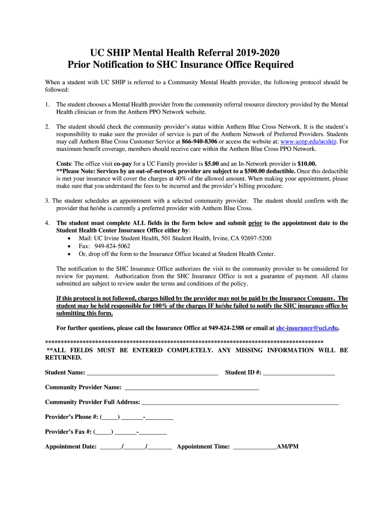 Get the free SHIP Mental Health Referral Prior Notification to SHC ... - counseling uci