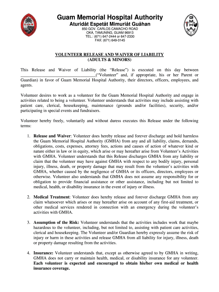 Guam Memorial Hospital Authority Naturist Spent Minuit Wuhan 850 GOV. CARLOS CAMACHO ROAD OK, TUNING, GUAM 96913 TEL.: (671) 6472444 or 6472330 Faxes: (671) 6490145VOLUNTEER RELEASE AND WAIVER OF