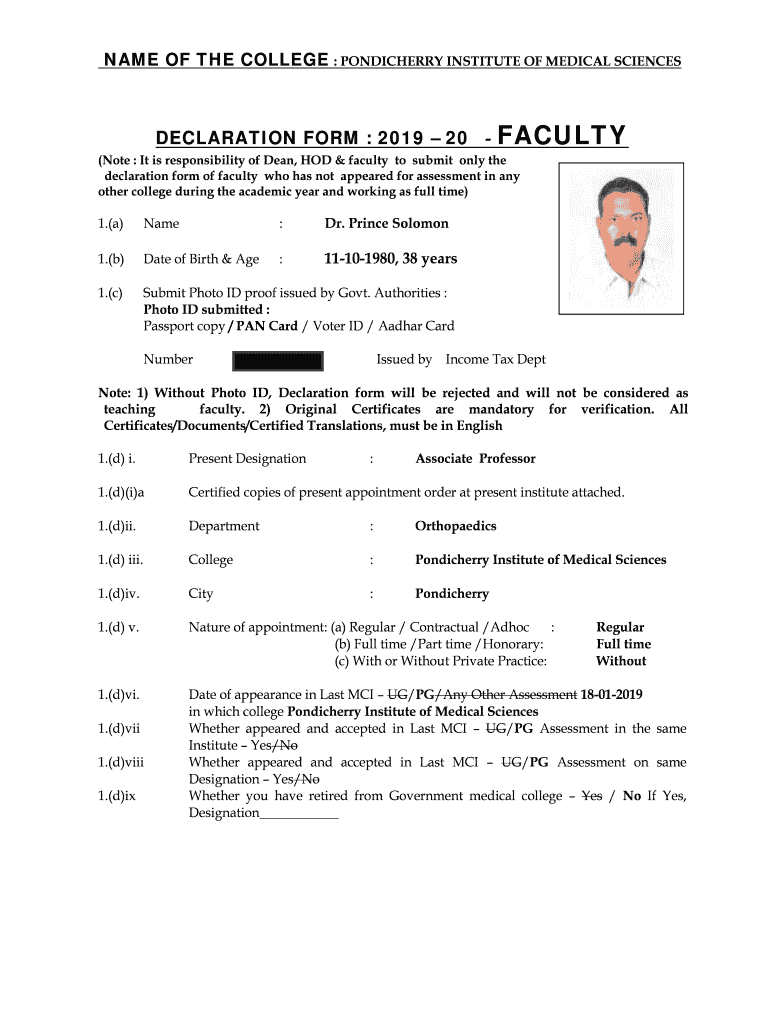 NAME OF THE COLLEGE : PONDICHERRY INSTITUTE OF MEDICAL SCIENCESDECLARATION FORM : 2019 20 FACULTY(Note : It is responsibility of Dean, HOD & faculty to submit only the declaration form of faculty