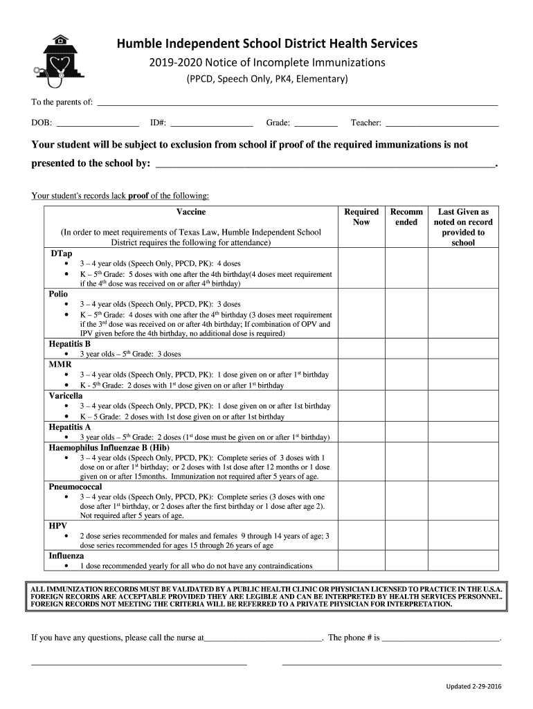 Humble Independent School District Health Services :20192020 Notice of Incomplete Immunizations (PPD, Speech Only, PK4, Elementary)To the parents of: DOB: ID#: Grade: Teacher: Your student will be