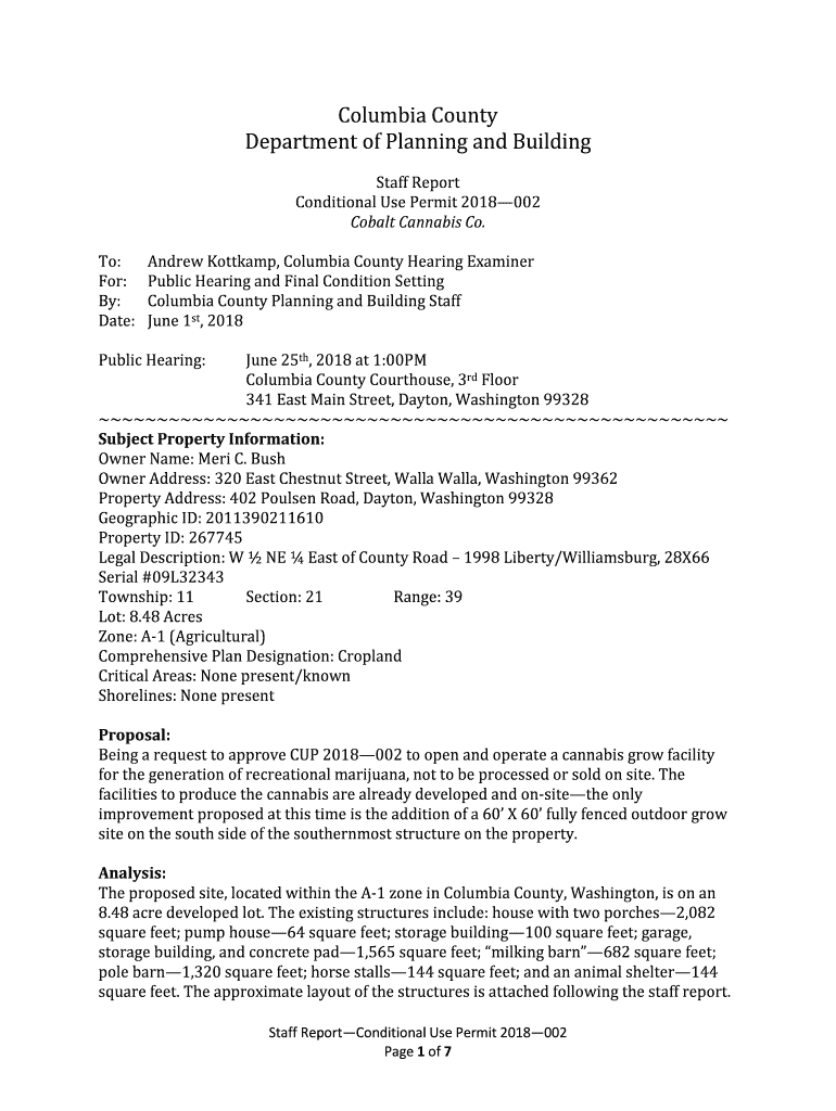 Columbia County Department of Planning and Building Staff Report Conditional Use Permit 2018002 Cobalt Cannabis Co. To: For: By: Date:Andrew Kottkamp, Columbia County Hearing Examiner Public Hearing