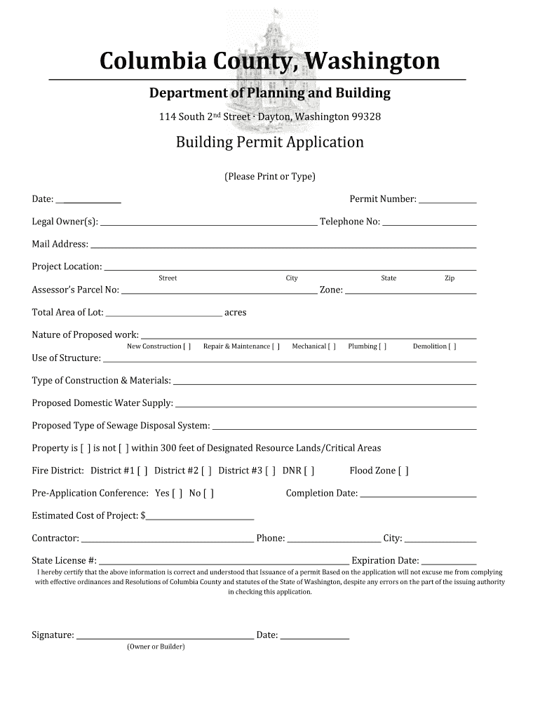 Columbia County, Washington Department of Planning and Building 114 South 2nd Street Dayton, Washington 99328Building Permit Application (Please Print or Type) Date: Permit Number:Legal Owner(s):Telephone