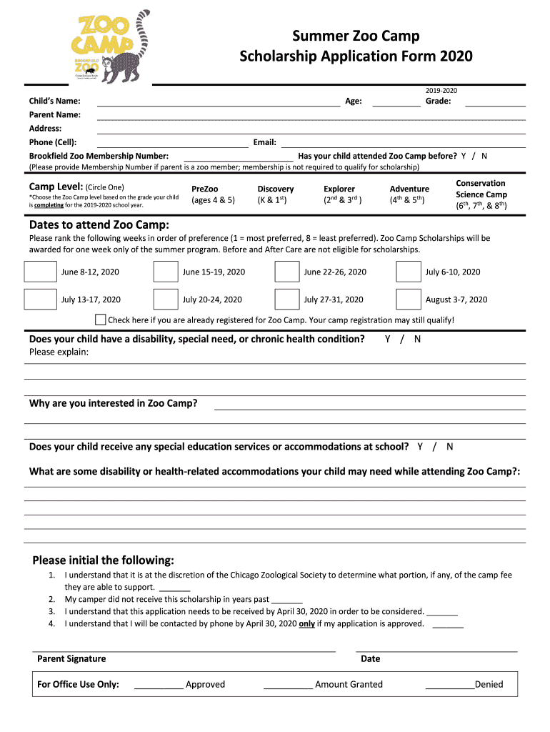 Summer Zoo Camp Scholarship Application Form 2020 20192020Childs Name: Parent Name: Address: Phone (Cell): Brookfield Zoo Membership Number:Age:Grade:Email: Has your child attended Zoo Camp before?
