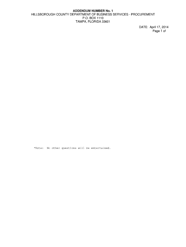 ADDENDUM NUMBER No. 1 HILLSBOROUGH COUNTY DEPARTMENT OF BUSINESS SERVICES PROCUREMENT P.O. BOX 1110 TAMPA, FLORIDA 33601 DATE: April 17, 2014-Page 1 of TO BIDDER: This Addendum is an integral part