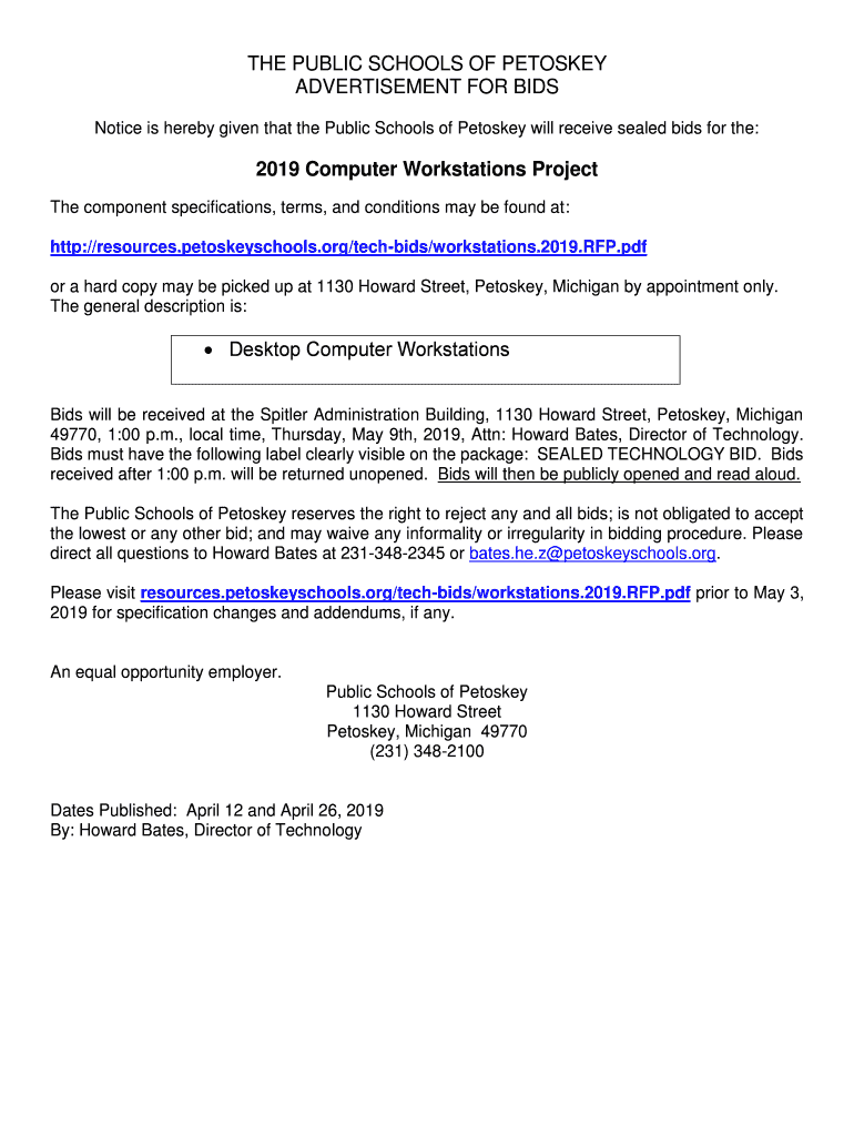 Notice is hereby given that the Public Schools of Pentosan will receive sealed bids for the:2019 Computer Workstations Project