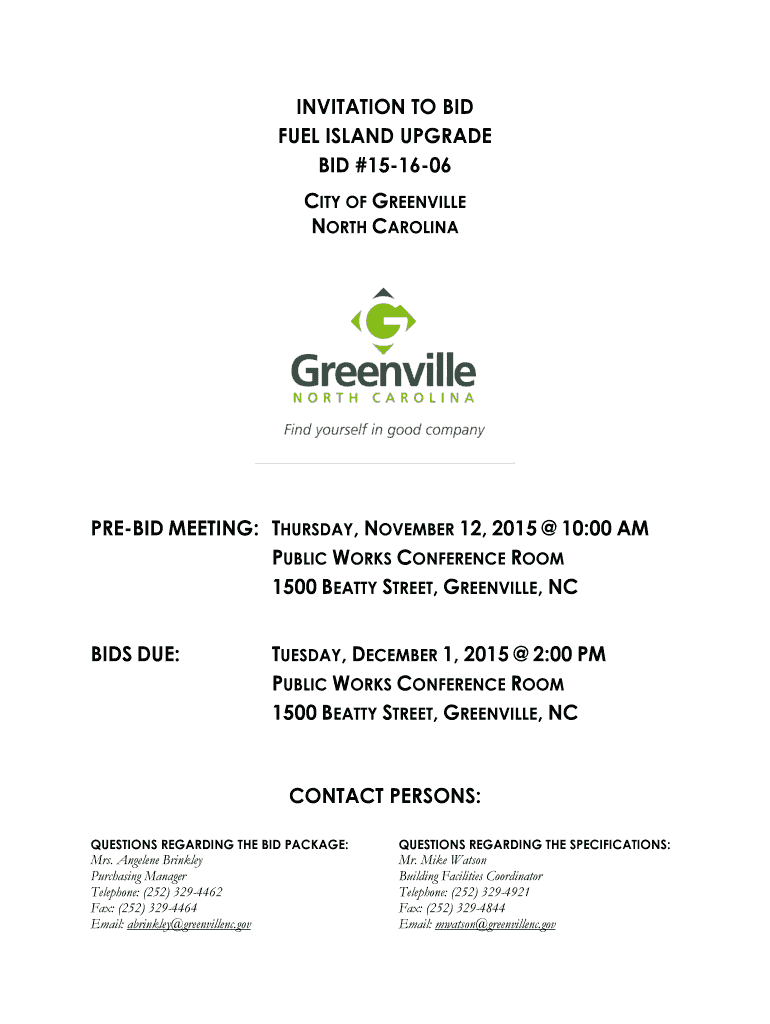 INVITATION TO BID FUEL ISLAND UPGRADE BID #151606 CITY OF GREENVILLE NORTH CAROLINAPREBID MEETING: THURSDAY, NOVEMBER 12, 2015 10:00 AM PUBLIC WORKS CONFERENCE ROOM 1500 BEATTY STREET, GREENVILLE,