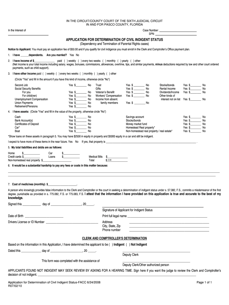 IN THE CIRCUIT/COUNTY COURT OF THE SIXTH JUDICIAL CIRCUIT IN AND FOR PASCO COUNTY, FLORIDA In the Interest of Case Number: SON:APPLICATION FOR DETERMINATION OF CIVIL INDIGENT STATUS (Dependency and