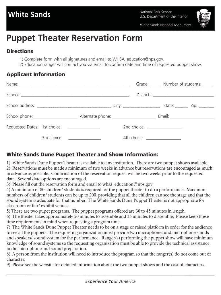 National Park Service U.S. Department of the Interior White Sands National MonumentPuppet Theater Reservation Form Directions1) Complete form with all signatures and email to HSA education NPS.gov.
