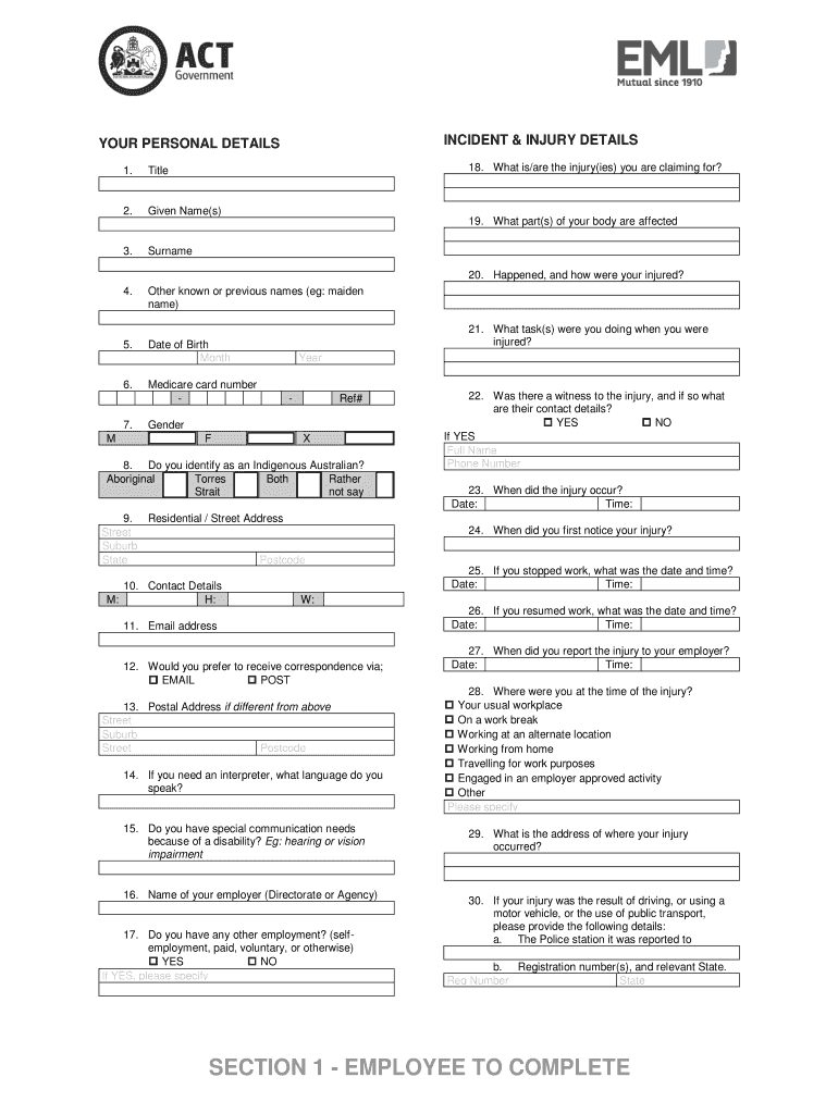 INFORMATION FOR WORKERS This form is to be completed if you are an Australian Capital Territory Public Service (the ACTS) who wishes to claim workers compensation under the Safety, Rehabilitation