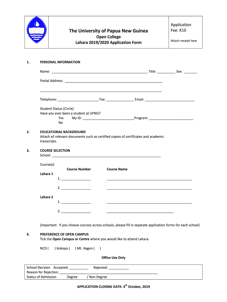 The University of Papua New Guinea Open College Sahara 2019/2020 Application Form1. Application Fee: K10 Attach receipt chairperson INFORMATION Name: Title: Sex: Postal Address: Telephone: Fax: Email: