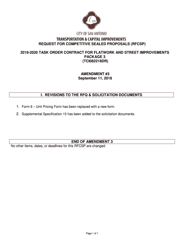 REQUEST FOR COMPETITIVE SEALED PROPOSALS (RFCs) 20192020 TASK ORDER CONTRACT FOR FLATWORM AND STREET IMPROVEMENTS PACKAGE 3 (TCI082218DR)AMENDMENT #3 September 11, 2018I. REVISIONS TO THE RFQ & SOLICITATION