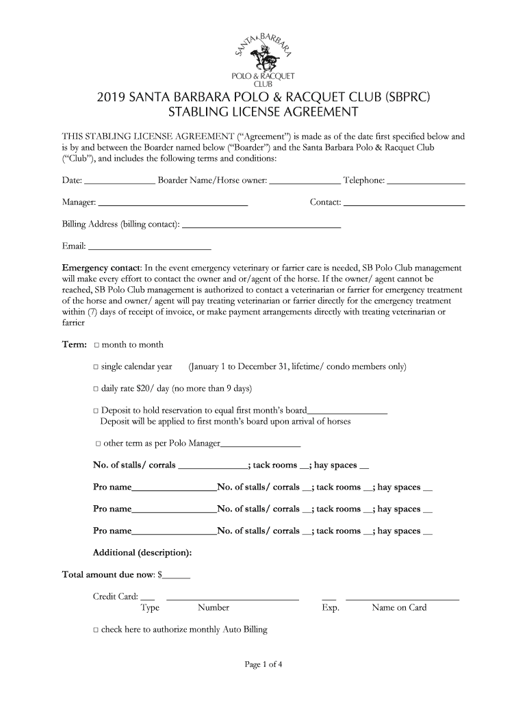 2019 SANTA BARBARA POLO & RACQUET CLUB (SB PRC) STABLING LICENSE AGREEMENT THIS STABLING LICENSE AGREEMENT (Agreement) is made as of the date first specified below and is by and between the Boarder