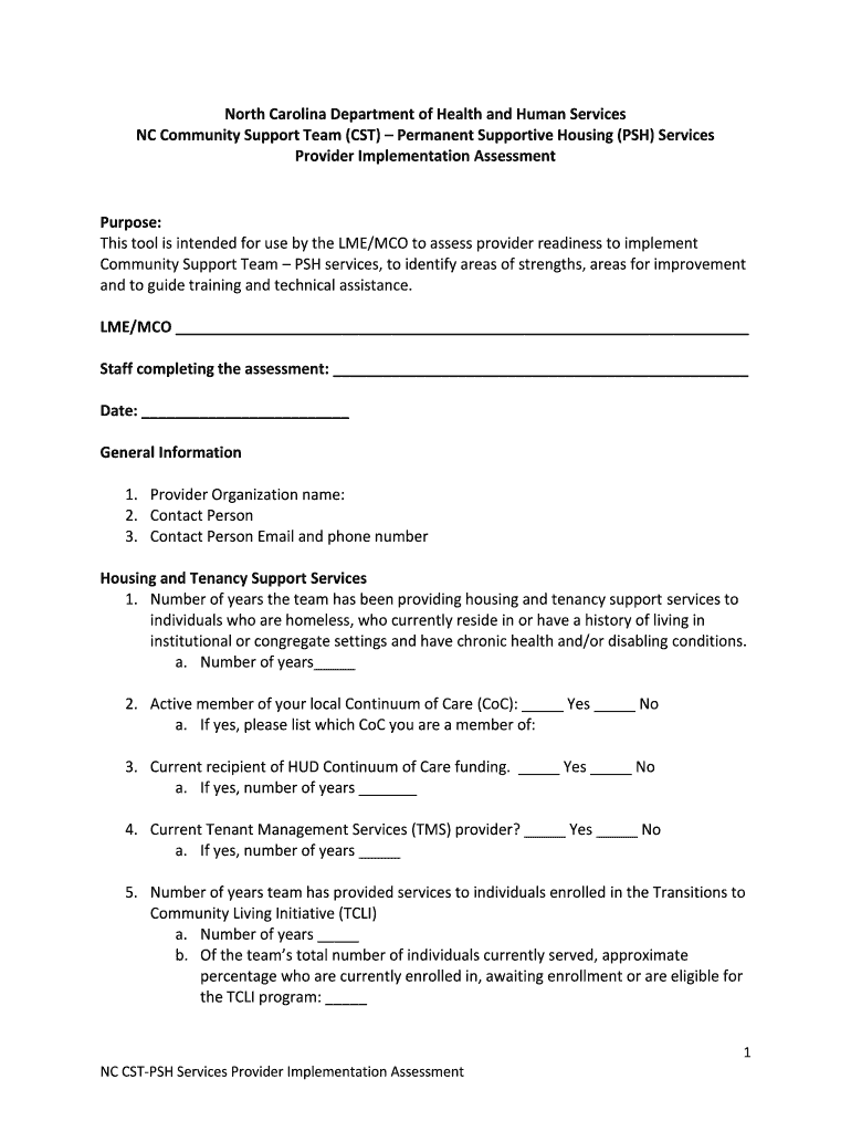 North Carolina Department of Health and Human Services NC Community Support Team (CST) Permanent Supportive Housing (PUSH) Services Provider Implementation AssessmentPurpose: This tool is intended