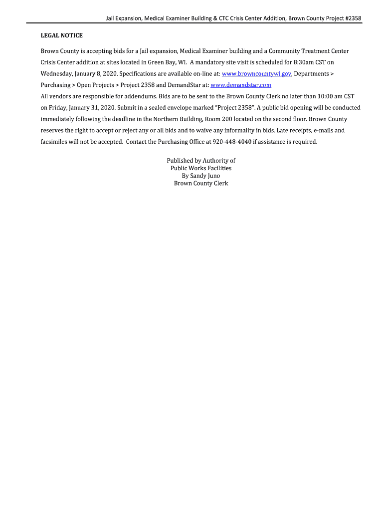 Jail Expansion, Medical Examiner Building & CTC Crisis Center Addition, Brown County Project #2358 LEGAL NOTICE Brown County is accepting bids for a Jail expansion, Medical Examiner building and a