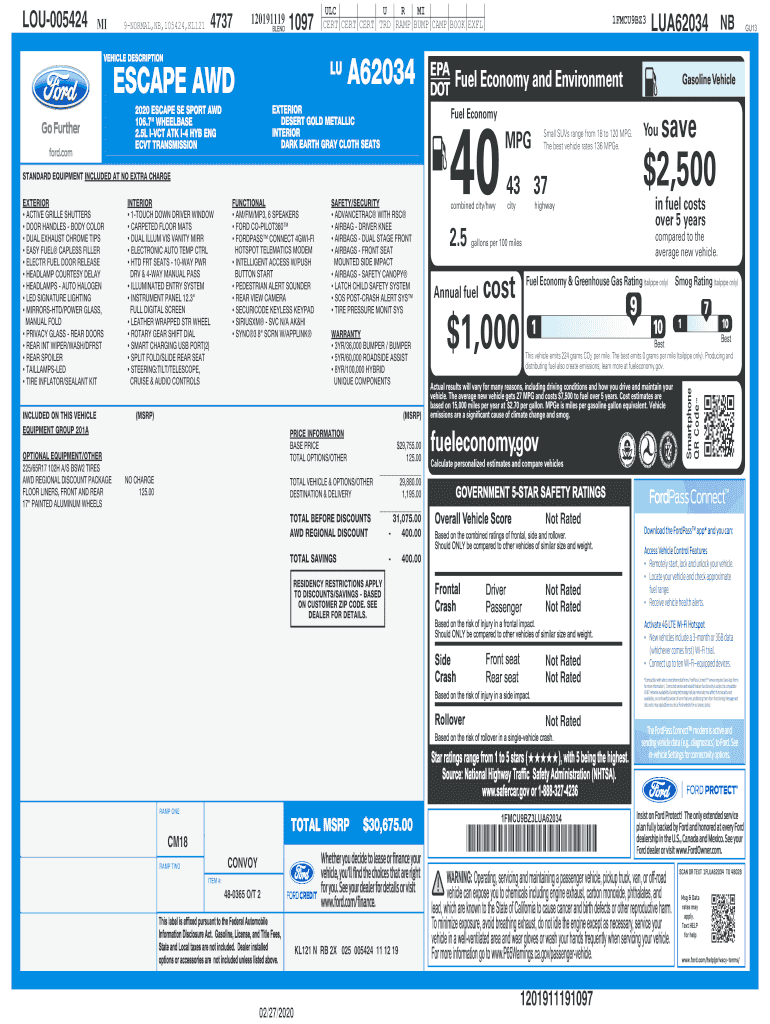 LOU005424MI9NORMAL,NB,105424,KL1214737120191119 BLEND1097VEHICLE DESCRIPTION ULC U R MI CERT CERT CERT TRY RAMP BUMP CAMP BOOK EXFLLUESCAPE Awful EconomySTANDARD EQUIPMENT INCLUDED AT NO EXTRA CHARGE