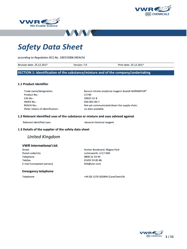 Revision date: 25.12.2017Version: 7.0Print date: 25.12.2017SECTION 1: Identification of the substance/mixture and of the company/undertaking