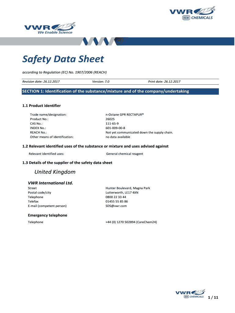 Revision date: 26.12.2017Version: 7.0Print date: 26.12.2017SECTION 1: Identification of the substance/mixture and of the company/undertaking