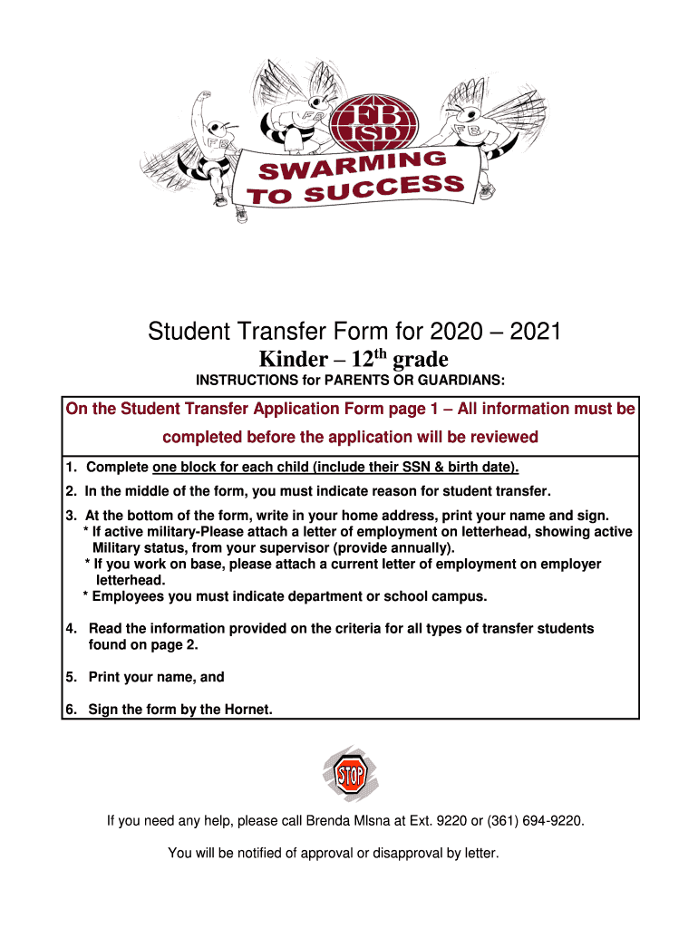 Student Transfer Form for 2020 2021 Kinder 12th grade INSTRUCTIONS for PARENTS OR GUARDIANS:On the Student Transfer Application Form page 1 All information must be completed before the application
