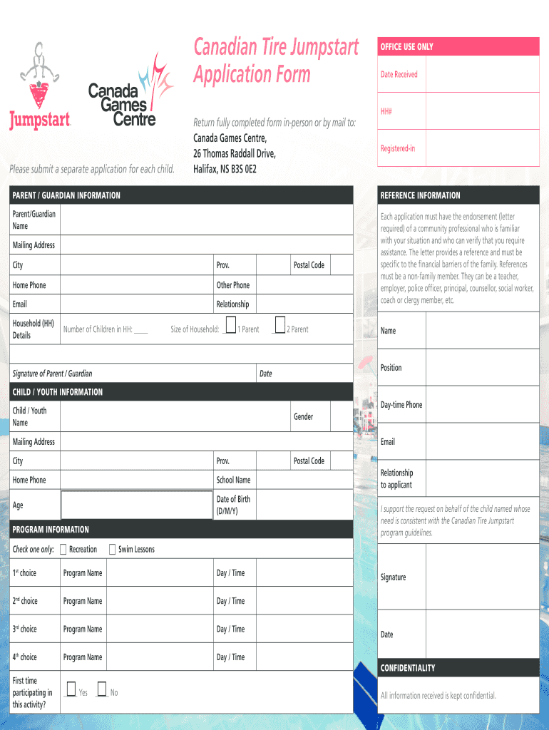 The Canadian Tire Jumpstart Application Form is an application used by parents or guardians to apply for financial assistance for their children to participate in recreational programs in Nova Scotia.