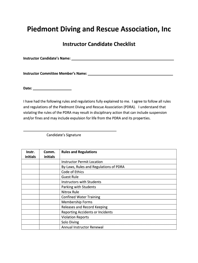 Get the free New Instructor Check List - Piedmont Diving amp Rescue Association - ncpdra